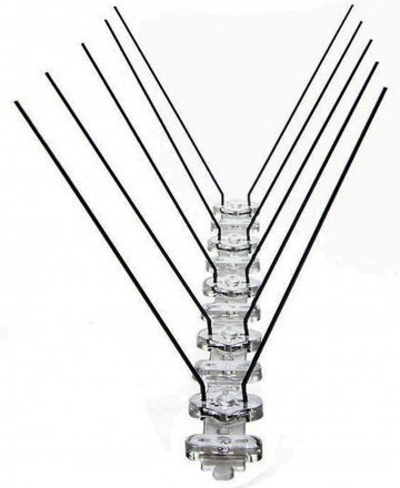 Антиприсадочные шипы представляют собой небольшую конструкцию из продольной пластины поликарбоната с несколькими торчащими иглами. Конструкция имеет низкую стоимость и достаточно высокое качество, это прекрасный способ защиты участка от птиц. Для изготовления шипов используется оцинкованная сталь, располагаются они в два ряда. Гибкое основание из поликарбоната дает возможность разместить конструкцию даже на неровных поверхностях.